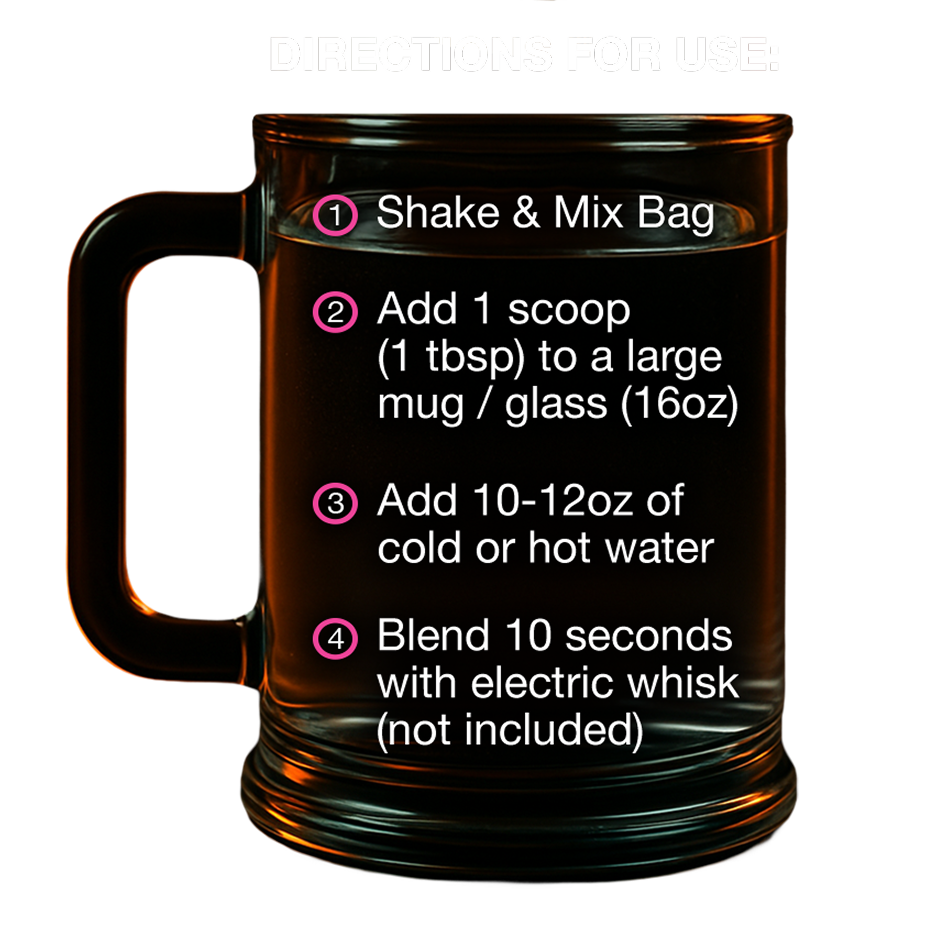 Put 12oz hot or cold water in a 16oz mug/glass, then add 1 scoop (1 tablespoon) of powder, mix with an electronic whisk (not included), then sip and enjoy like you would a cup of coffee or energy drink.
