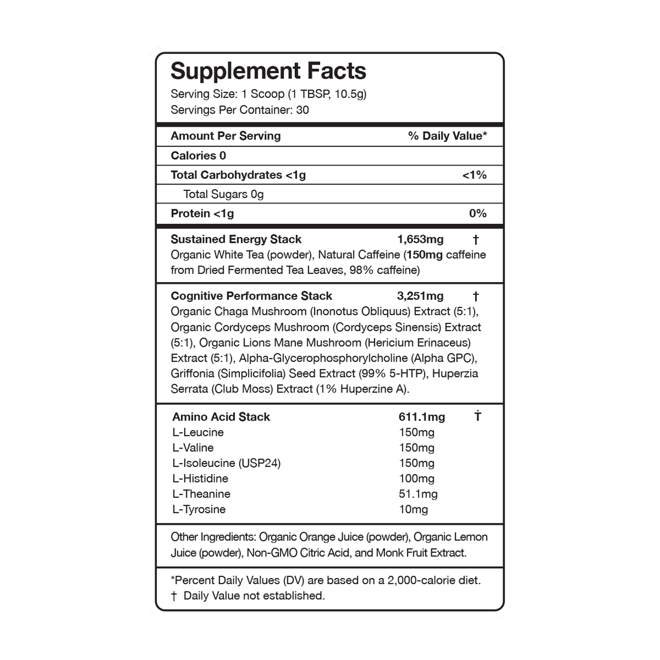 Organic White Tea Powder, Organic Chaga Mushroom Extract, Organic Cordyceps Extract, Organic Lion’s Mane Extract, Alpha-GPC, 5-HTP, Huperzia Serrata (Club Moss), Natural Caffeine (from Tea, 150mg), Organic Orange Juice Powder, Organic Lemon Juice Powder, Non-GMO Citric Acid & Natural Monk Fruit Extract.